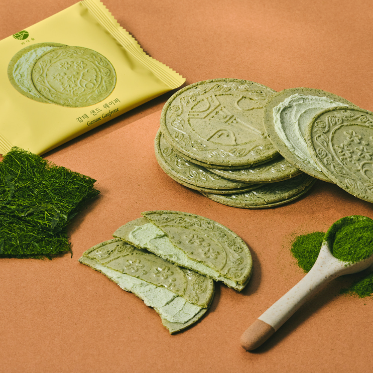 감태 샌드 웨이퍼는 바삭한 웨이퍼 사이에 감태 크림을 채운 과자예요. 기분 좋은 단맛과 감태 특유의 은은한 쌉싸름함, 바삭한 식감이 한 입에 어우러져요. 차나 커피와 함께 즐기기에도 딱 좋아요.