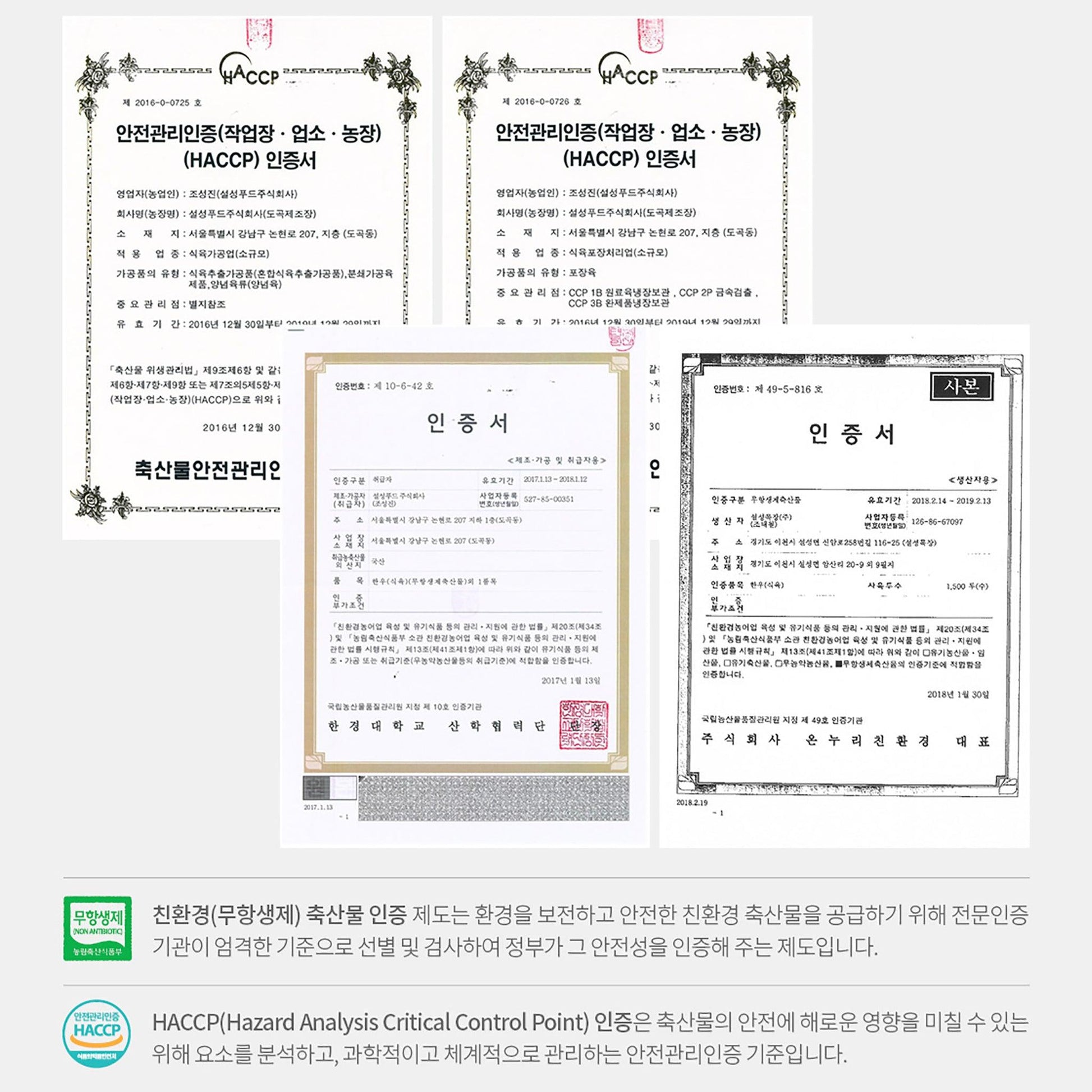 설성한우는 친환경 (무항생제) 축산물 인증을 받았어요. 성장호르몬이나 성장촉진제도 투여하지 않지요. 도축장은 물론 설성목장의 목장과 가공장도 HACCP (안전관리인증기준) 인증을 받았습니다.