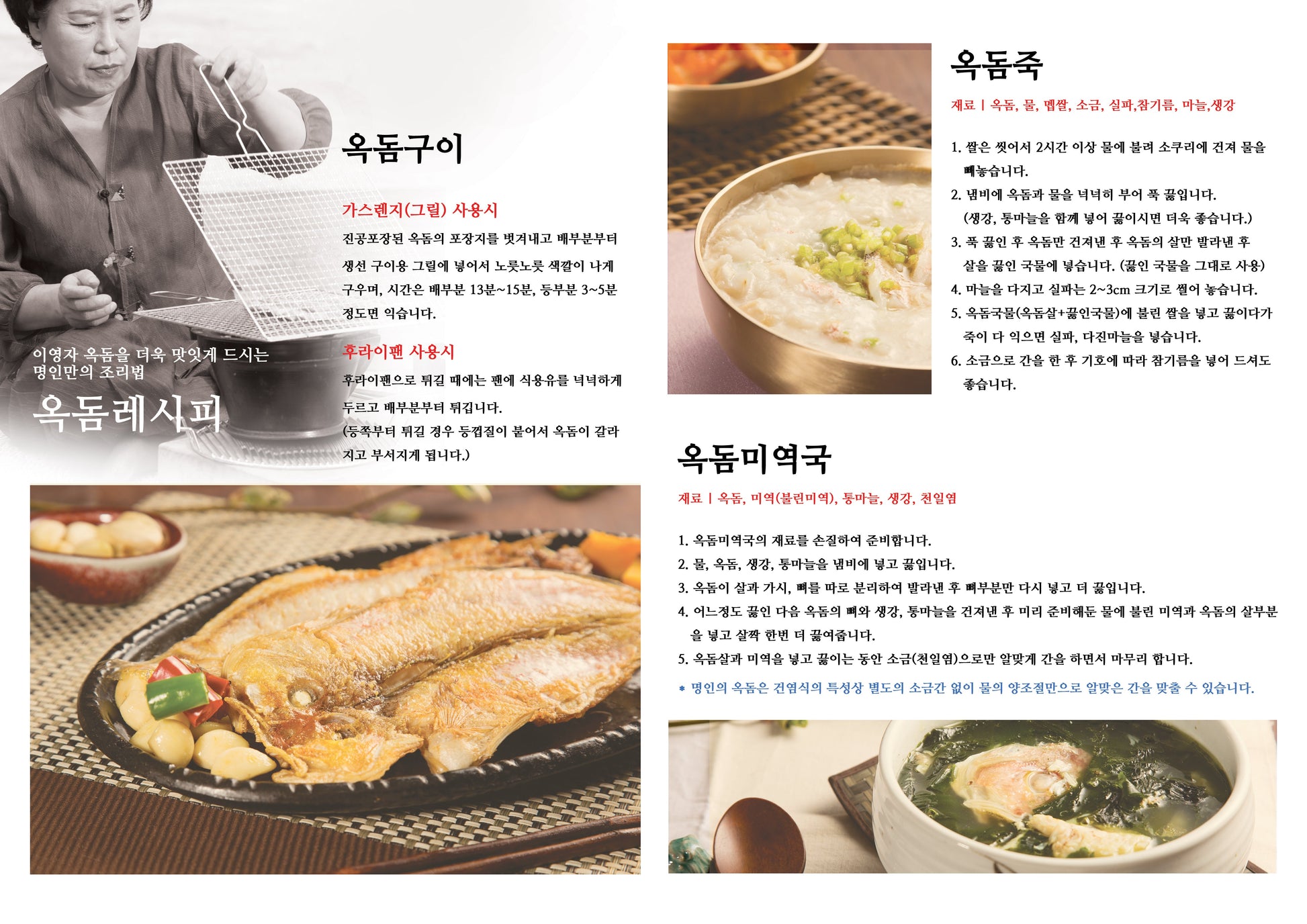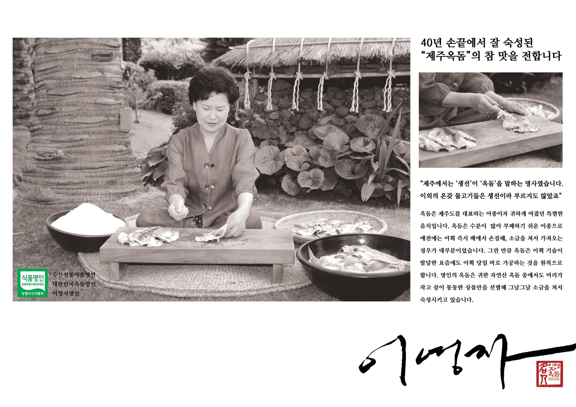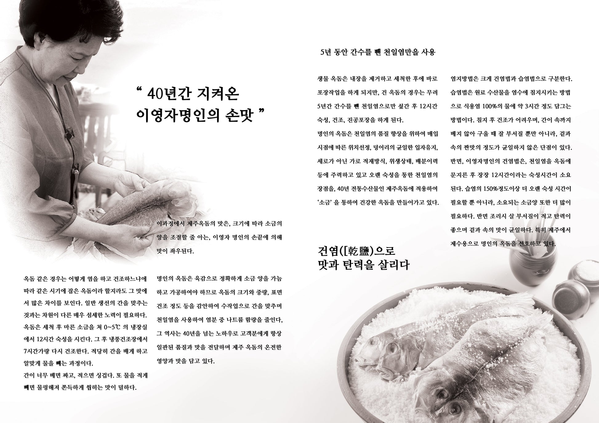 한국에서 옥돔 가공기술을 보유한 유일한 두명의 명인중 한분인 이영자 명인의 옥돔을 소개합니다. 전남 나주에서김치 젓갈장사로 시작하여 제주도로 피난후, 동문 재래시장에서 옥돔 가공기술을 취득한 어머니 박순례님으로부터 전수받은 이영자 명인은, 40년 넘게 직접 옥돔을 수급하고, 명인의 손으로 직접 소금을 바르고, 숙성하고 말려 정갈하고 담백한 맛을 유지시키므로써 옥돔 명인이라는 타이틀을 가지게 되지요. 임금님의 수라상에만 올릴수 있을만큼 귀한 옥돔을 계속해서 발전시키고자, 아들 고경현 대표가 기술을 전수받으며 제주도의 삼대 생선인 고등어, 은빛 갈치, 옥돔 등의 가공기술을 직접 배우고 있습니다.