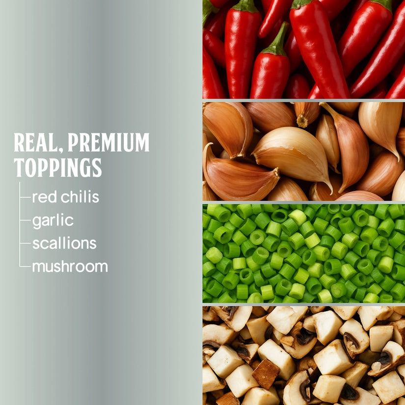 Toppings: Dried garlic, mushroom, scallion, and red pepper flakes
