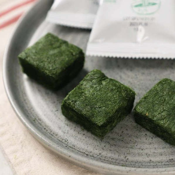 완도의 건조 매생이는 제철에 수확한 매생이를 한 입 크기로 잘라 여러 차례의 세척 공정 과정을 거칩니다. 각 과정마다 꼼꼼하게 확인을 하고요. 해초류 속 뻘이나 미생물을 99% 사멸시키는 오존수 세척시설로 깨끗하게 씻어내지요. 급속 냉동고에서 얼린 후 건조 과정을 거쳐 신선도가 최대한 유지되고 사시사철 곁에 두고 즐기는게 가능해졌지요. 50g의 생물 매생이는 여러 절차 후 건조 매생이 2g 짜리 큐브 하나로 탈바꿈하지요. 1봉에 1인분량이에요.
