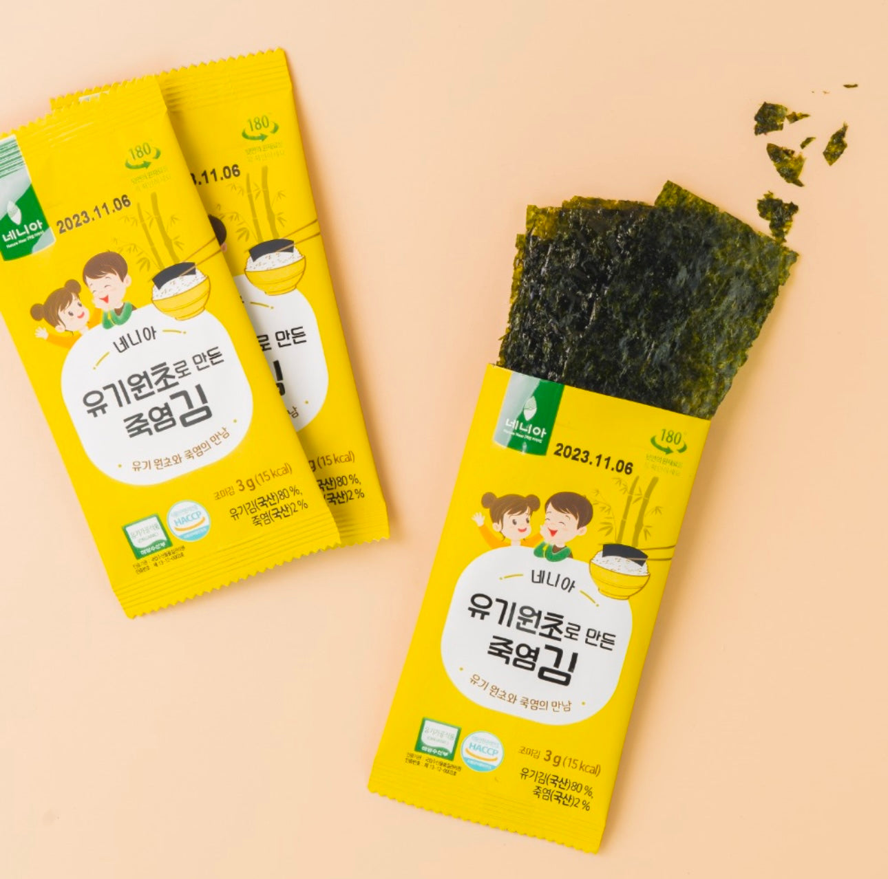 네니아의 유기농 김은 유기농 김, 유기농 카놀라유, 죽염만 사용해 화학 성분 없이 원초적인 맛을 살렸습니다. HACCP 및 유기농 인증을 받았으며, 20개의 개별 포장(총 60g)으로 도시락, 간식, 소풍에 적합합니다.