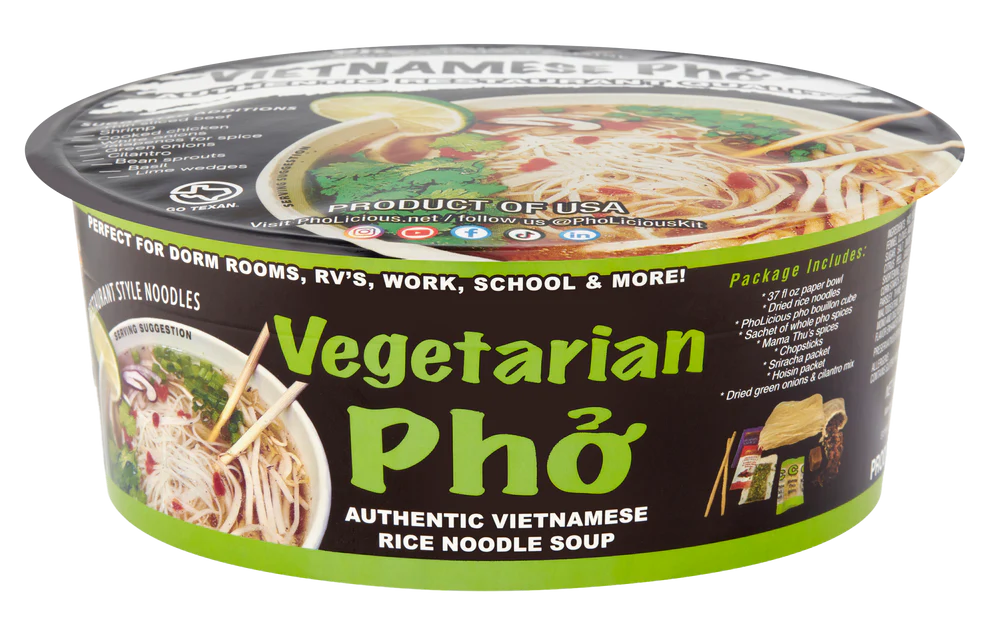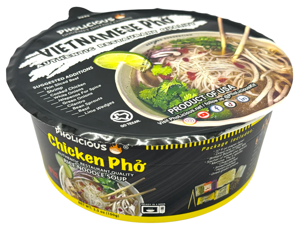PhoLicious is a delicious, authentic, and traditional instant Vietnamese noodle soup. Your journey begins with our unique recipe of rice noodles, steamed and dried to perfection. The magic lies in combining our proprietary bouillon, crafted from real beef & chicken, with a special blend of aromatic whole spices in a tea bag form, then tying it all together with spices inspired by Mamma Thu's cherished family recipe. Experience Pho soup perfection like never before. Each spoonful delivers an indescribable flavor that truly captures the essence of authenticity. PhoLicious is a great ramen alternative!